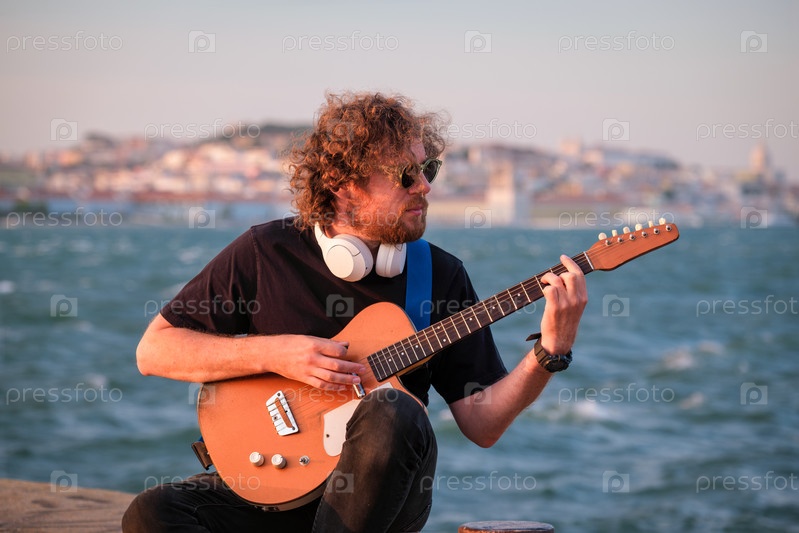 Хипстерский уличный музыкант в черном играет на электрической гитаре снаружи при закате солнца на набережной с Лиссабоном на заднем плане