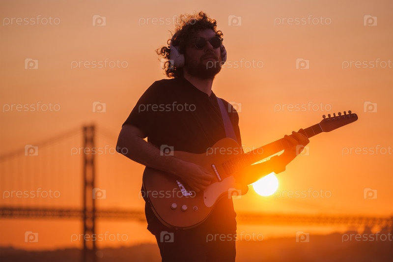 Уличный музыкант Хипстер в черном играет на электрической гитаре снаружи при закате