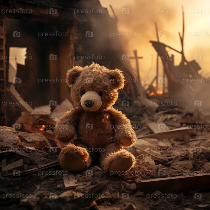 Концепция трагедии детей войны - печальный плюшевый медведь, оставленный в руинах разрушенного во время войны дома