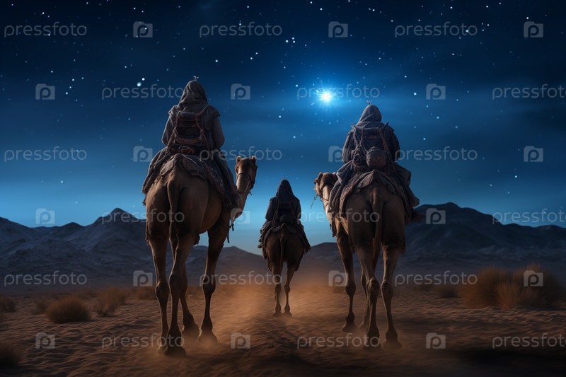 Три мудреца, три короля следуют за звездой Вифлеема ночью