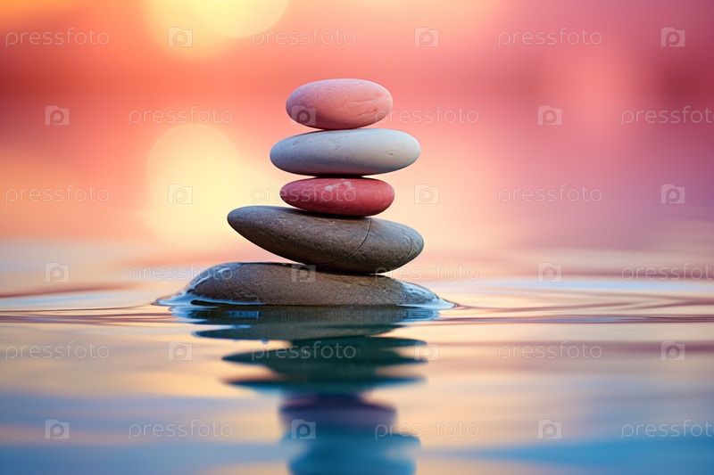 Куча дзен-камней на воде с естественным фоном. изображение передает ощущение равновесия, гармонии и мира. подходит для использования в концепциях исцеления, терапии и релаксации