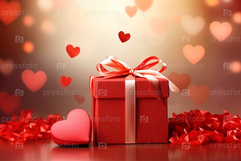 Valentina Gift Red Gift Box, украшенная мягкой розовой лентой, окруженной конфети в форме сердца и фоном боке