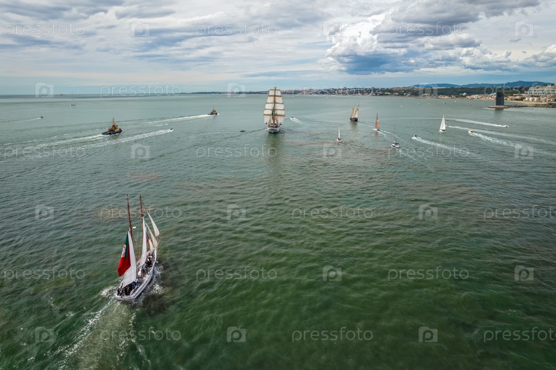 Вид высоких судов с парусами, плавающих в реке Таго к Атлантическому океану в Лиссабоне, Португалия