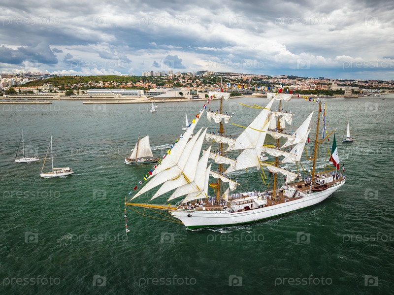 Вид высоких судов с парусами, плавающих в реке Таго к Атлантическому океану в Лиссабоне, Португалия