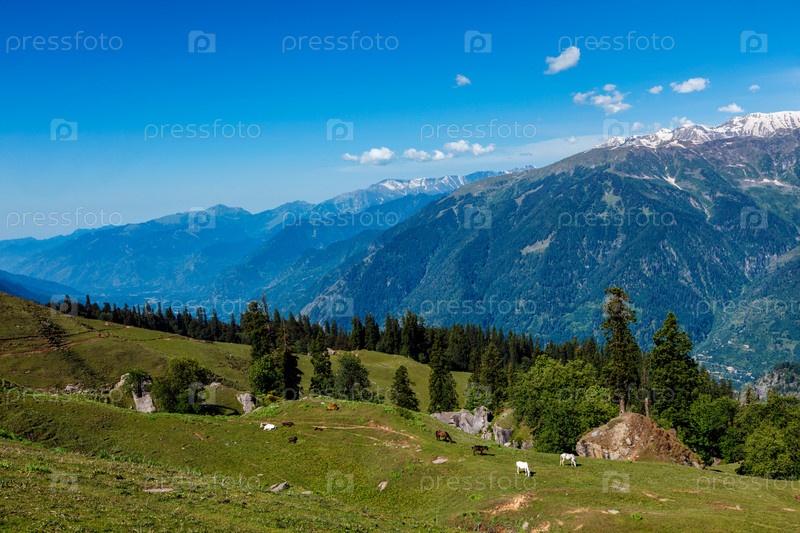 Лошади пасутся в горах Гималаев.Химачал-Прадеш, Индия