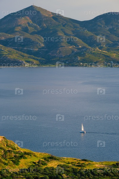Яхта в Эгейском море недалеко от острова Милос при закате солнца.Остров Милос, Греция