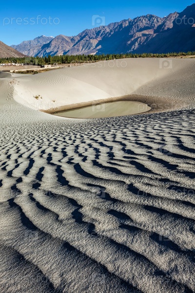 Песчаные дюны, окруженные горами в регионе Нубра Гималаев