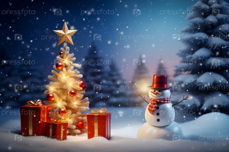 Праздничная рождественская сцена с елкой, снежным человеком и подарками в лесу