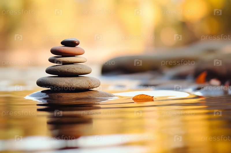Куча дзен-камней на воде с естественным фоном. изображение передает ощущение равновесия, гармонии и мира. подходит для использования в концепциях исцеления, терапии и релаксации