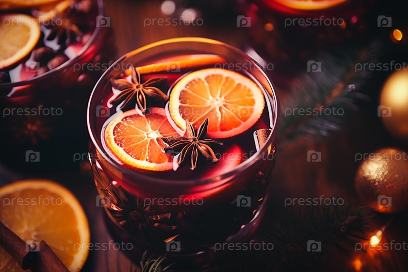 Стакан традиционного горячего вина с апельсиновыми и клюквенными блюдами на уютном рождественском столе.Фон размыт огнями боке и свечами, создавая теплую и праздничную атмосферу