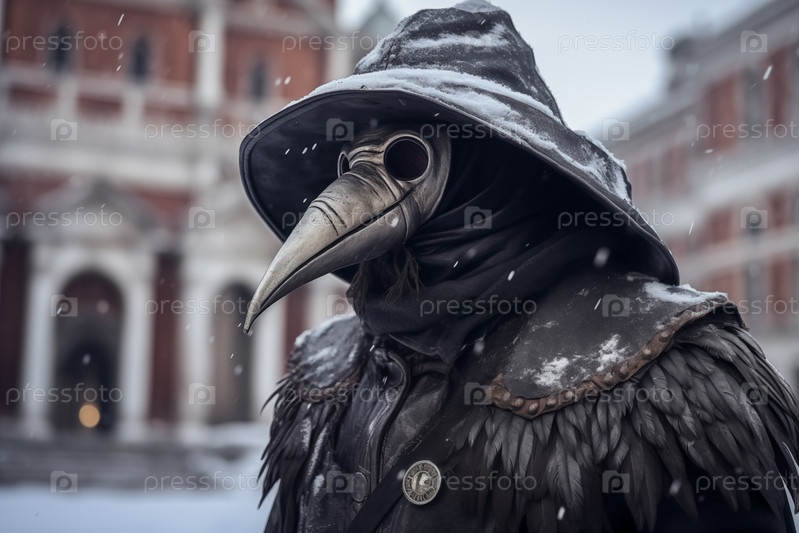 Чумной доктор. Person dressed as a plague doctor, adorned with the iconic crow mask, amidst the snowfall at the Venice Carnival