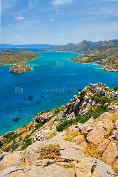 Остров Спиналонга со старой крепостью бывшей колонии прокаженных и заливом Элунда, Крит, Греция