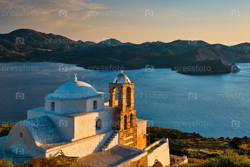 Традиционная белая греческая православная церковь в деревне Плака на острове Милос при закате солнца.Остров Милос, Греция