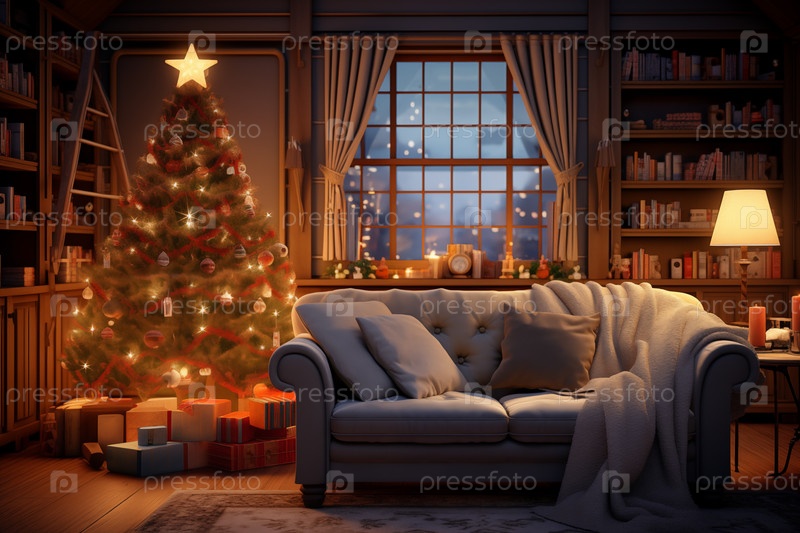 Уютная внутренняя гостиная, украшенная рождественской елкой с коробками для подарков.Изображение отражает теплую и гостеприимную атмосферу праздничного сезона