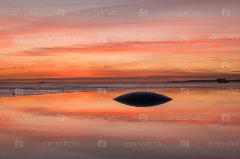 Фонтан и бассейн рядом с фондом Champalimaud, португальским некоммерческим учреждением для научных медицинских исследований в Белеме отражают закат солнца