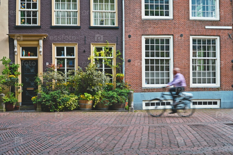 Человек на велосипеде - очень популярное средство передвижения в Нидерландах на улице со старыми домами Дельфта, Нидерланды