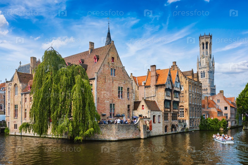 Известной туристической достопримечательностью Брюгге является канал Розенхоedkaai с колокольником и старыми домами вдоль канала с деревом и туристской лодкой