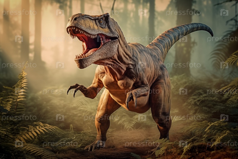 Тираннозавр Рекс рычит в доисторическом лесу с пышной растительностью, папоротниками и солнечным светом