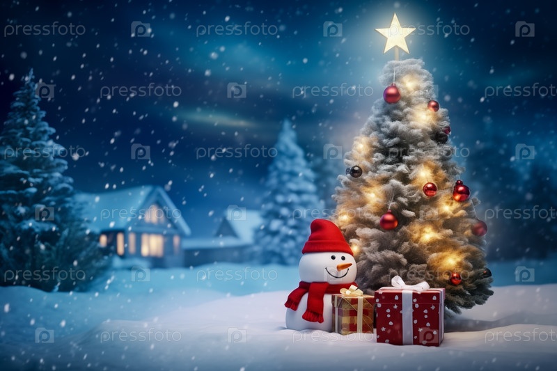 Мирная и безмятежная рождественская сцена с украшенной елкой с подарками и милым снежным человеком в заснеженном лесу