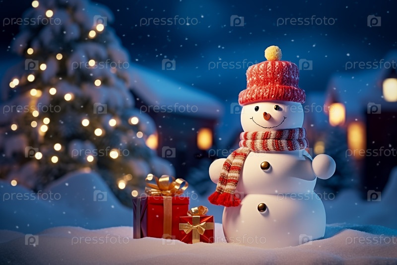 Мирная и безмятежная рождественская сцена с украшенной елкой с подарками и милым снежным человеком в заснеженном лесу