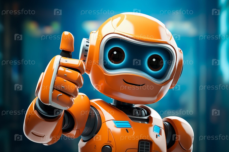 Оранжевый робот показывает большой палец вверх. Дружеский робот имеет большие круглые глаза и дружелюбную улыбку. Концепция одобрения технологии искусственного интеллекта, успеха, дружбы