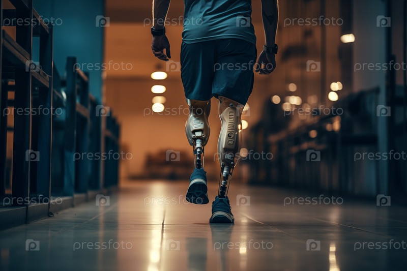 Спортсмен-ампутированный, идущий по коридору с бионическими протезными ногами с роботизированной технологией.Достижения в медицинской науке и технологии, решимость, сила, прогресс инвалидов