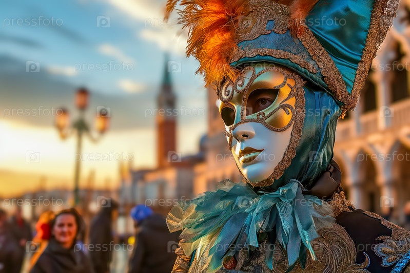 Мужчина, украшенный богато детализированным и красочным карнавальным костюмом в комплекте с сложной маской, участвует в знаковом Венецианском Карнавале