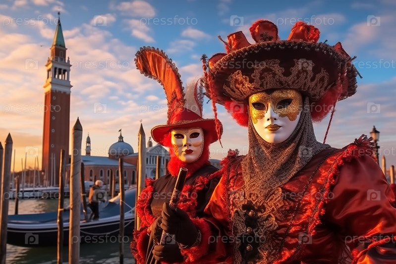 Элегантные люди в ярких карнавальных костюмах и масках на Венецианском фестивале