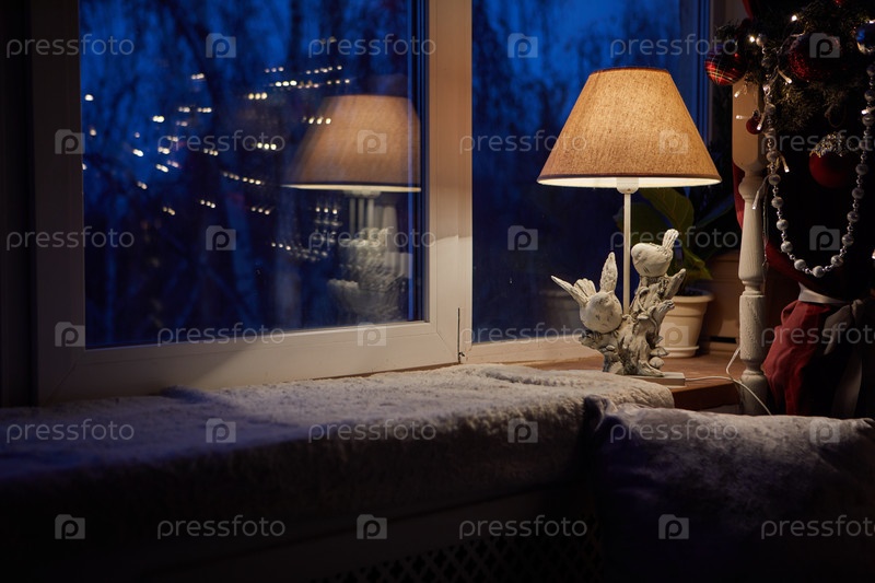 Уютная вечерняя сцена с теплой лампой и отражением окна, вызывая глубокий покой