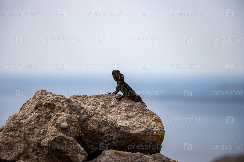 Ящерица греется на теплой скале под солнечным светом в естественном каменистом ландшафте