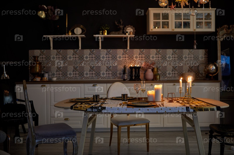 Элегантная современная кухня с уютным и свечником на обед