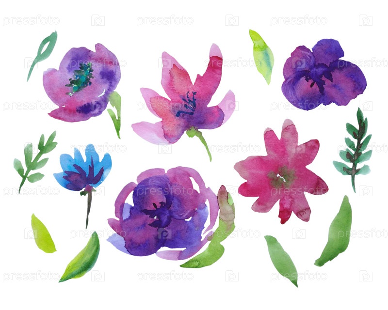 Набор клипартов - фиолетовые и розовые цветы, выделенные на белом фоне. Иллюстрация сделана акварелью в свободном стиле от руки