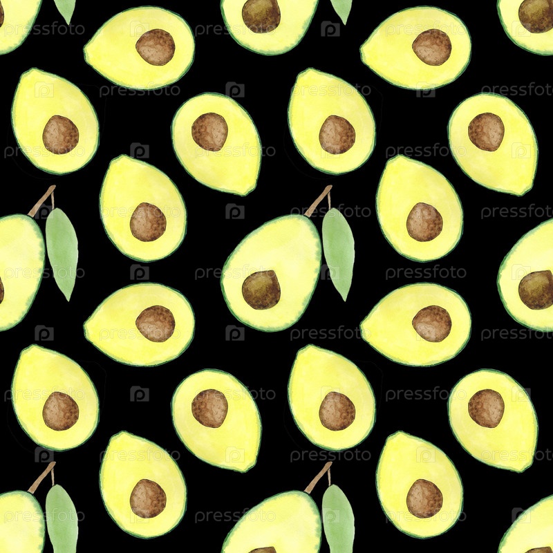 Бесшовный рисунок с половинками авокадо на черном фоне. его можно использовать для тканей, упаковочной бумаги, текстиля, открыток, обложек, обоев, меню. иллюстрация написана вручную акварелью