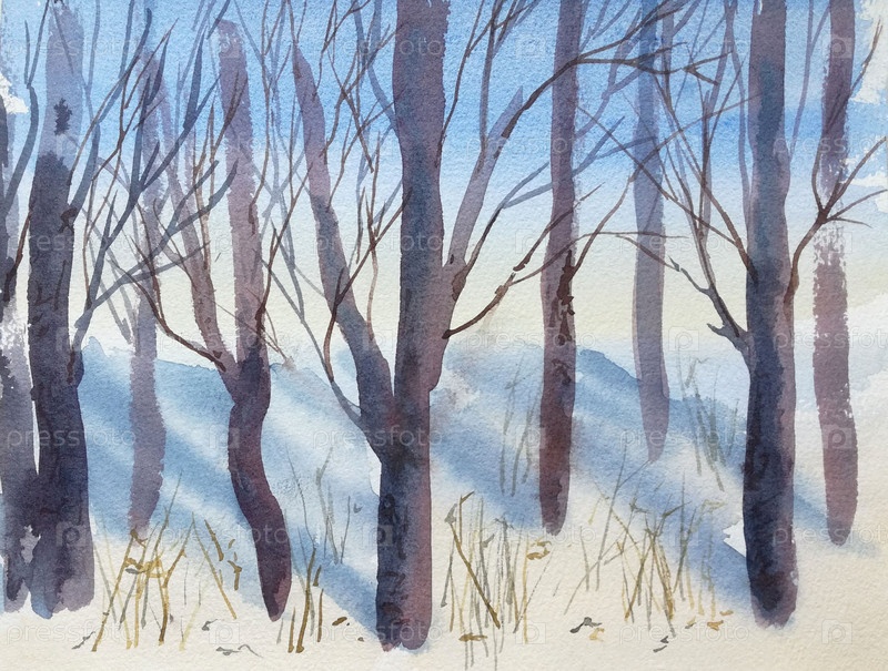 Природный пейзаж с зимними деревьями, нарисованными акварелью вручную. Подходит для открыток, плакатов