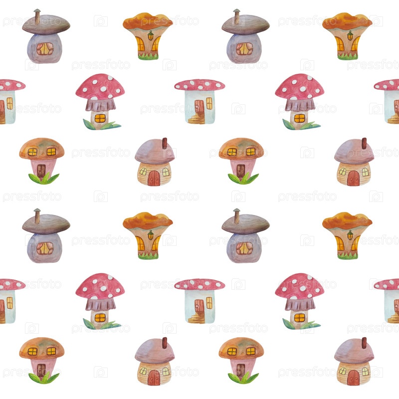 Бесшовный рисунок с грибными домиками на белом фоне. Дома в форме люстры, мух агарики и других грибов. Рисовать акварель рукой. Детский чертеж для обоев или ткани
