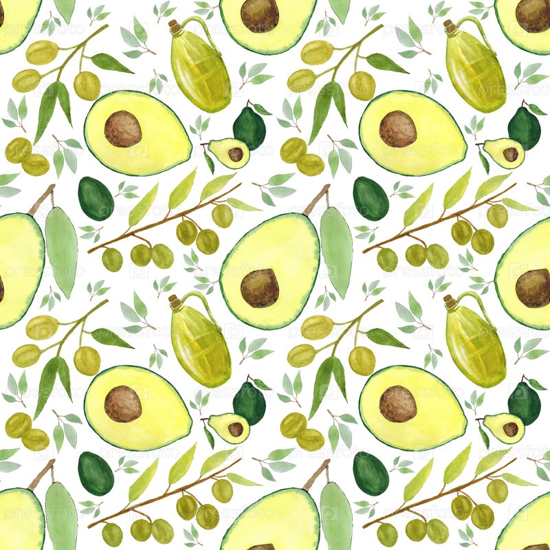Оливки, авокадо, наполовину размером с авокадо, оливковое масло, масличные ветви. Бесшовный рисунок на белом фоне. Ручно нарисованная акварель. Может использоваться для ткани, упаковочной бумаги, обложки меню, почтовой машины