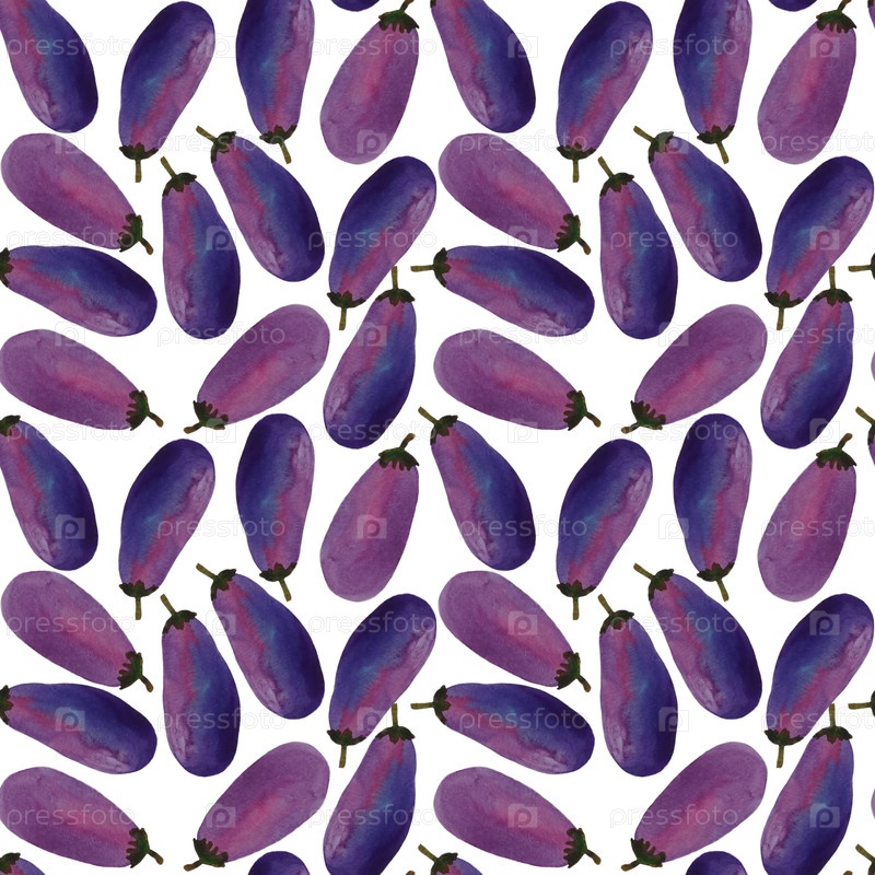 Бесшовный растительный рисунок, баклажан на белом фоне. Рисовать акварель вручную. Может быть применен к ткани, обои, открытки, упаковки, плакат
