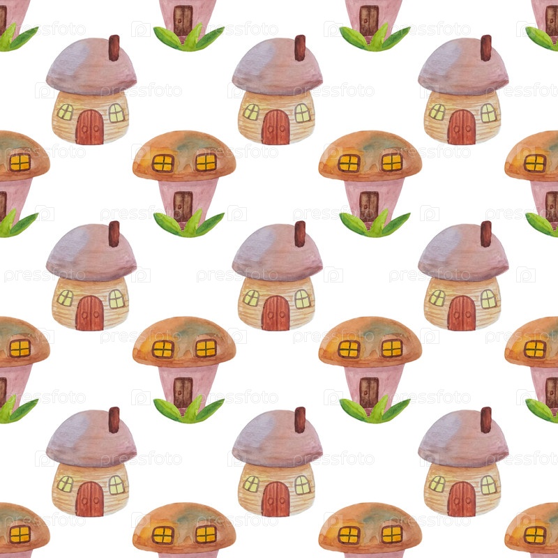 Бесшовный узор с мультфильмами в виде грибов на белом фоне. Рисуйте акварели рукой. Может использоваться для ткани, обложек, открыток, обоев, упаковочной бумаги, скарапбукинга