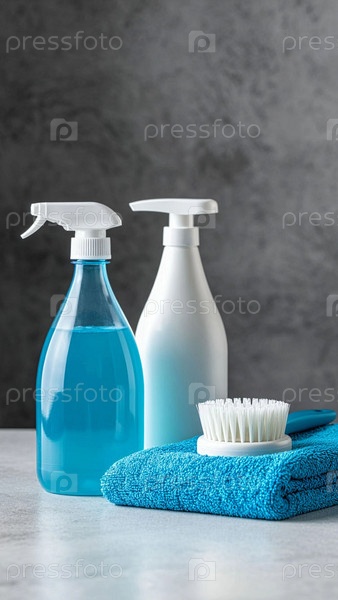 Бутылки с бытовыми химикатами, кисть и полотенце на сером фоне