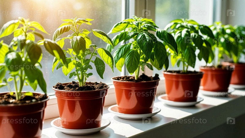 Выросший рассадник стоит под солнцем на подоконнике