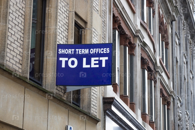 Голубые таблички, прикрепленные к традиционному фасаду каменного здания с надписью 'Краткосрочные офисы разрешены', указывают на доступность коммерческой недвижимости в центре города