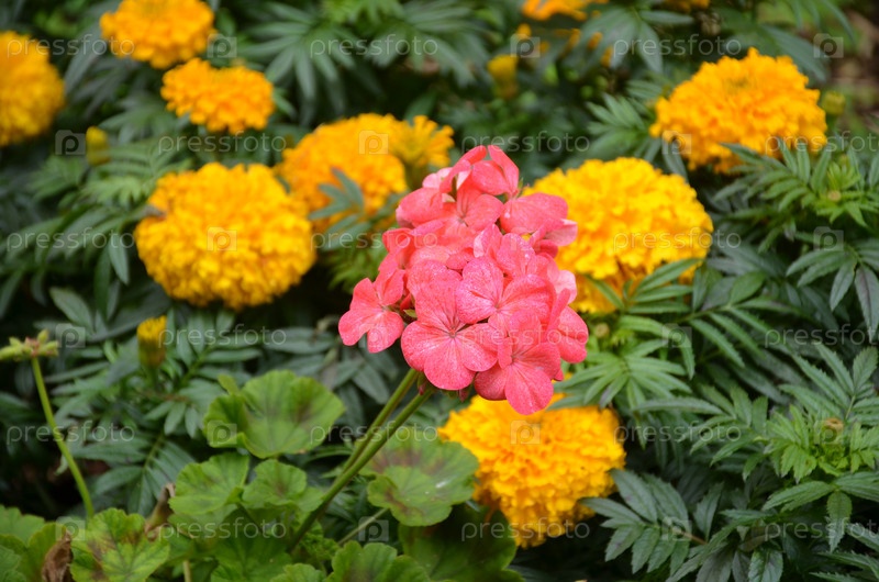 Крупные желтые бархатники (лат. tagetes) и пеларгониум (лат. pelargonium) среди зеленых листьев осеннего сада
