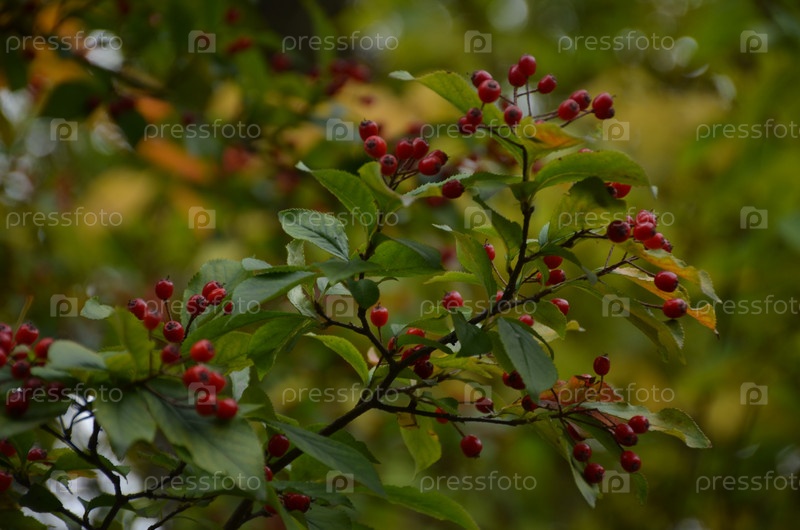 Осенний ботанический сад Петра Великого в Санкт-Петербурге: хвойный куст (Crataegus) с красными ягодами