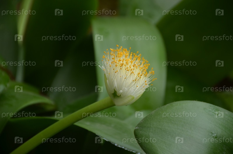 Белоцветный гемантус (Haemanthus albiflos) семейства Амариллис (Amaryllidaceae): белый цветок с ярко-желтыми штаммами на фоне темно-зеленых листьев