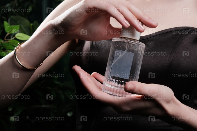 Девушка держит стеклянную бутылку с парфюмом без логотипа