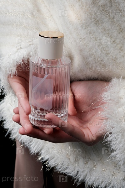 Девушка держит стеклянную бутылку с парфюмом без логотипа