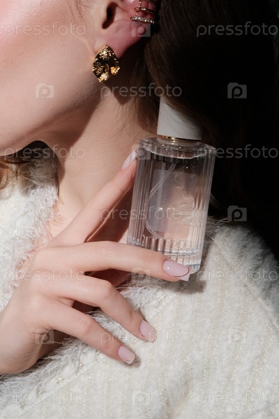 Девушка держит стеклянную бутылку с парфюмом без логотипа