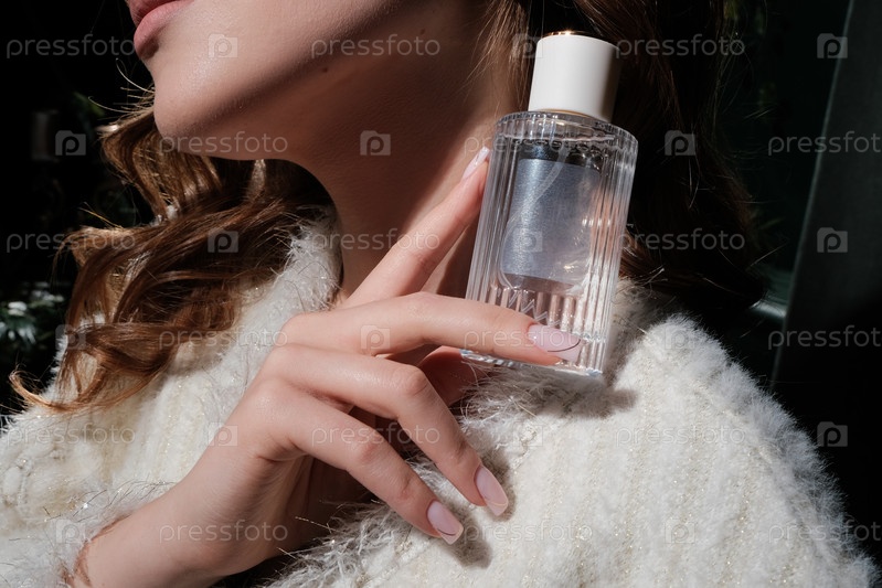 Девушка держит стеклянную бутылку с парфюмом без логотипа