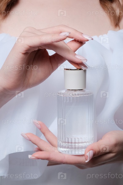 Девушка держит стеклянную бутылку с парфюмом без логотипа