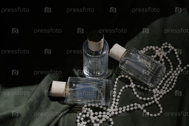 Три стеклянных бутылки для парфюма на ткани с жемчужинами